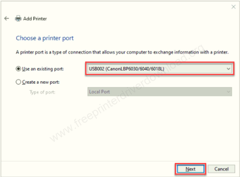 Step 7: Select the port: USB001, USB002 or USB003 and then click on Next.