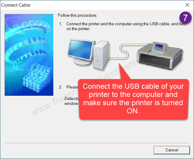 Step 7: Now please connect the USB cable between your printer and the computer. Also, make sure the printer is turned ON. The screen will detect your printer connection automatically, then click on Next and then click on the Finish button to complete the installation process.