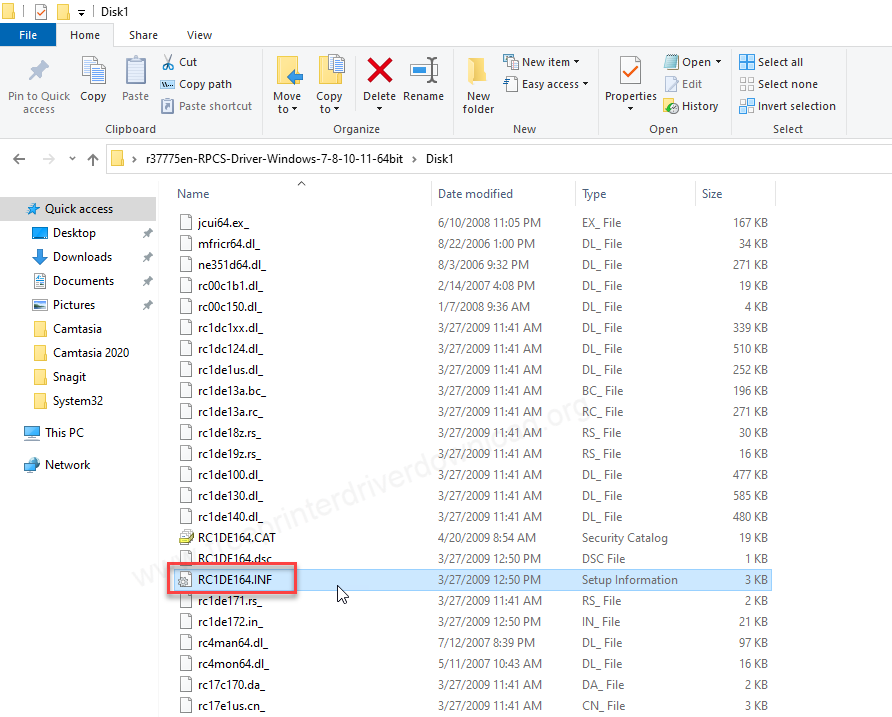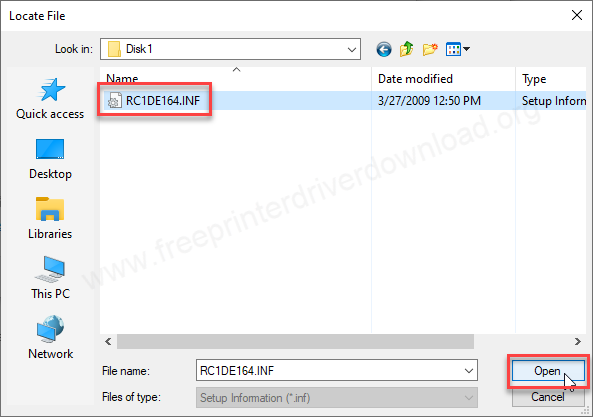 Step 12: Go to the location where you have extracted the driver files and then choose the driver file named “RC1DE164.INF” and click on open.