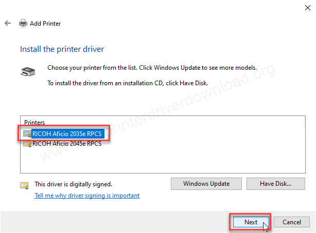 Step 14: It will show you a list of drivers, choose the model number 2035e and then click on Next. If you printer model number is 2045e then choose 2045e from the list.