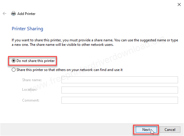 Step 17: Choose the first option “don’t share this printer” and then click on Next.