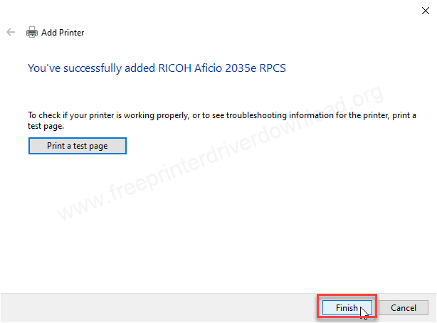 Step 18: The printer Ricoh Aficio 2035e printer has been installed successfully. Click on Finish to complete the installation process..