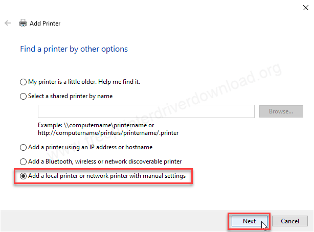 Step 8: Choose the last option “Add a local printer” and then click on Next.
